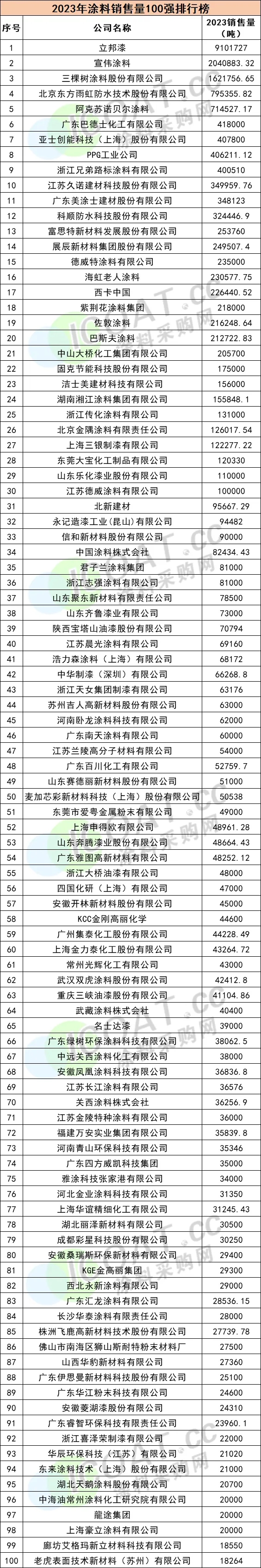 從涂料銷量100強企業同比變動情況來看,除去5家新企業無對比數據外,其余的95家企業中,67家銷量同比上漲,占比高達70.5%,與2022年同期的不到50%形成鮮明對比,前3名無一例外的超過了50%的增長比例: