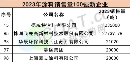 除此之外,2023年涂料銷量100強新上榜企業表現優異。德威特涂料、株洲飛鹿、華辰環保、龍途集團、上海豪立涂料等新上榜企業5家,銷量均在20000噸(含)以上,5家企業合計323759.78噸,占百強總銷售額的1.4%。