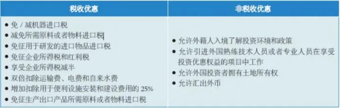 進(jìn)出口關(guān)稅優(yōu)惠:可免除資本貨物和原材料的關(guān)稅和進(jìn)口稅,投資者也可申請免除進(jìn)口增值稅和預(yù)提稅;