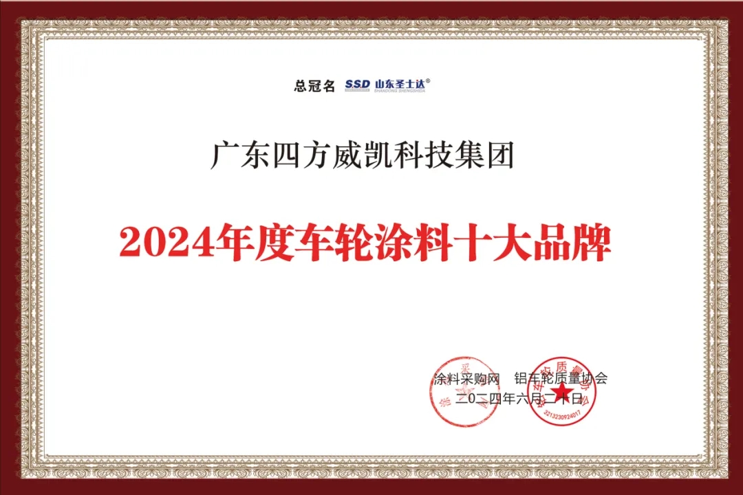 作為國家專精特新“小巨人”企業(yè)之一的廣東四方威凱新材料技術(shù)有限公司(以下簡稱“四方威凱”)以其先進的技術(shù)研發(fā)水平、高性價比的產(chǎn)品、完善的服務(wù)體系成功入圍“2024年車輪涂料十大品牌”。在本屆高峰論壇中,由鋁車輪質(zhì)量協(xié)會秘書長王孝東和“2024年車輪涂料十大品牌”總冠名山東圣士達機械科技股份有限公司副總經(jīng)理刁鵬方共同頒獎,并對四方威凱的入圍表示熱烈的祝賀。