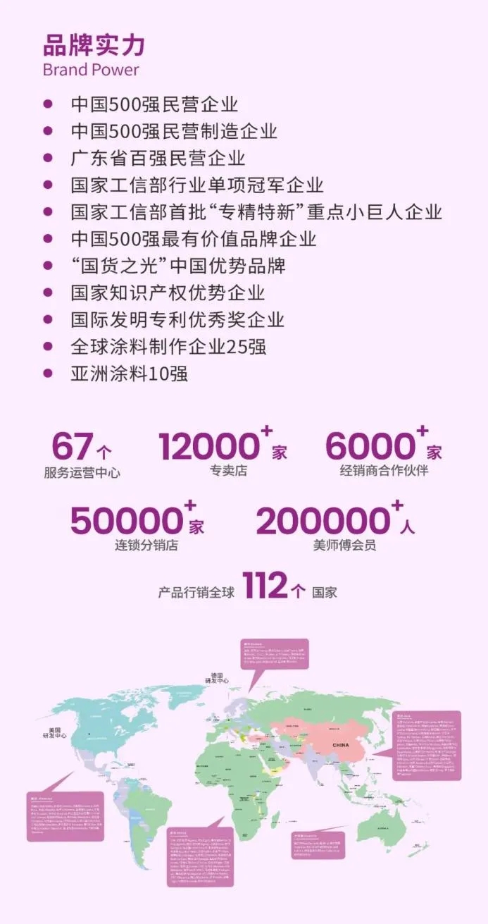 經過多年的研究與發展,目前美涂士在全國有多個生產基地,67個服務運營中心,超過12000家專賣店,5萬多家連鎖分銷店,美師傅會員超20萬人,產品遠銷全球112個國家和地區。現在已形成工業涂料、藝術涂料、仿石漆、乳膠漆、工程涂料、家具漆、膠粘劑、節能裝飾板、防水基輔材等九大專業品類優勢。