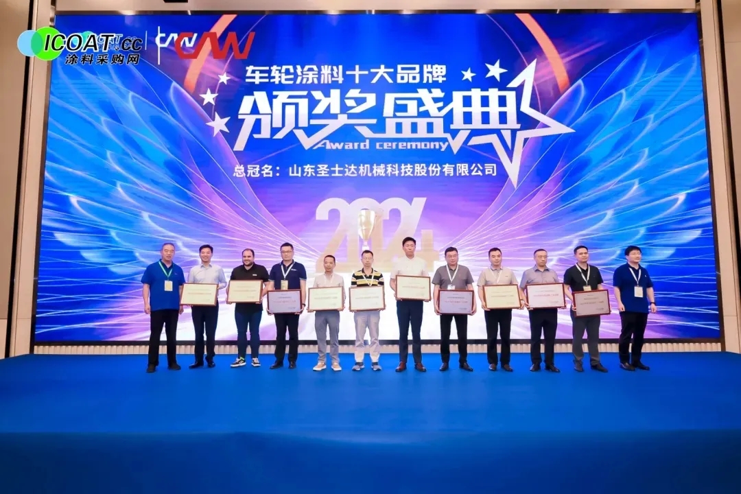 在本屆高峰論壇現場,由鋁車輪涂料質量協會秘書長王孝東隆重公布了“2024年車輪涂料十大品牌”獲獎企業名單,并與活動總冠名山東圣士達機械科技股份有限公司副總經理刁鵬方共同為獲獎企業頒獎。