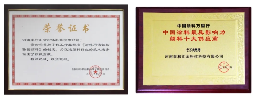 匠心鑄就品質,獎杯見證實力。泰和匯金斬獲了“ 中國涂料最具影響力顏料十大供應商”、“河南省科技型中小企業”等榮譽稱號。通過原有專利保護和現有專利申請,泰和匯金已榮獲專利35項,灰色磷鐵粉供貨量在全國油漆涂料廠占有量高達60%。