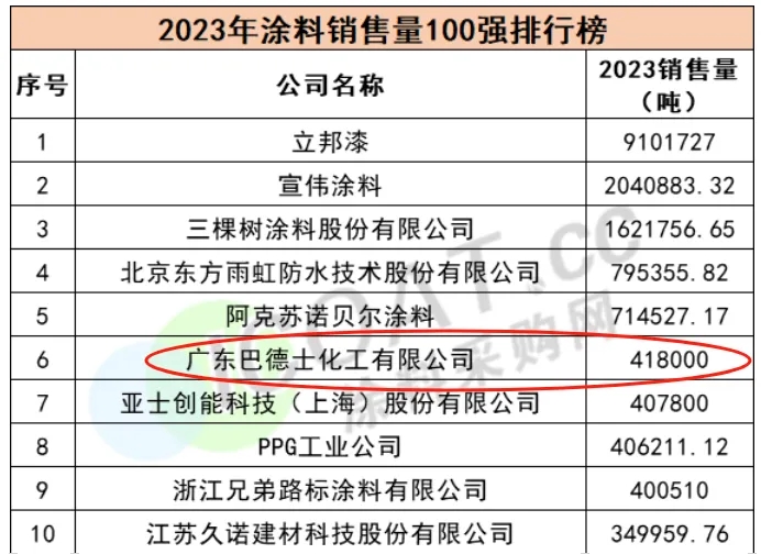 其中,廣東巴德士新材料有限公司(以下簡(jiǎn)稱(chēng)“巴德士”)以418000噸的銷(xiāo)售量位居第六,成功躋身涂料銷(xiāo)售量十強(qiáng)行列。據(jù)悉,2023年的百?gòu)?qiáng)榜單現(xiàn)狀仍是外資企業(yè)占據(jù)半壁江山,民族企業(yè)發(fā)展舉步維艱。然而。作為榜單十強(qiáng)中為數(shù)不多的中國(guó)企業(yè),巴德士在外資企業(yè)不斷擠占生存空間的情況下,仍取得了顯著的成就——今年的銷(xiāo)售量較去年增長(zhǎng)了38000噸,較去年同比增長(zhǎng)10%,排名也因此上升了一名,并逐年呈上升趨勢(shì)。值得注意的是,2023年銷(xiāo)售量區(qū)間為10-50萬(wàn)噸的涂料企業(yè)中僅有25家,占榜單總數(shù)的25.38%。巴德士作為這一區(qū)間中的領(lǐng)軍企業(yè),其銷(xiāo)售量更是突破40萬(wàn)噸大關(guān),實(shí)現(xiàn)了嶄新的跨越式發(fā)展。