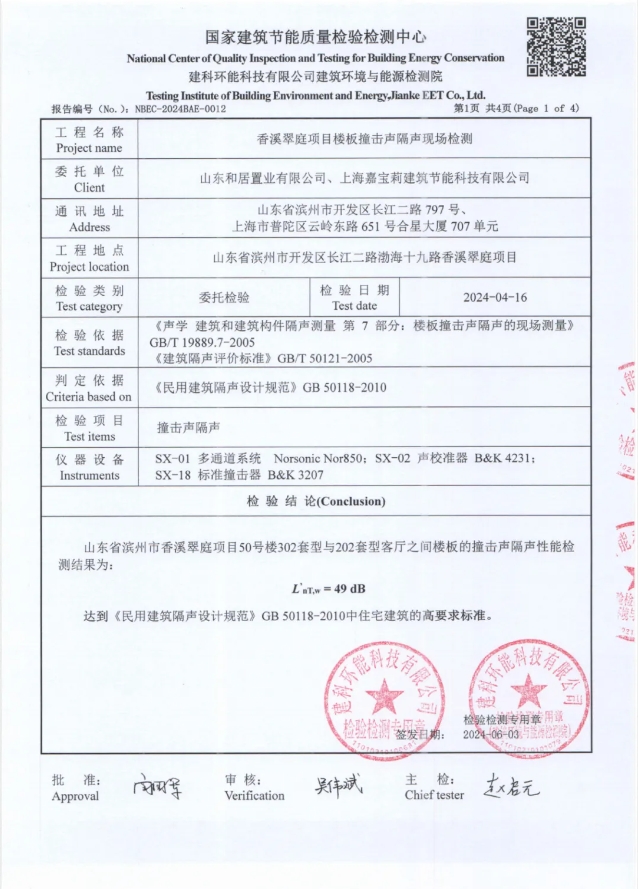 2023年,山東香溪翠庭項(xiàng)目中,尚微浮筑隔聲樓板的實(shí)際應(yīng)用展現(xiàn)了其卓越的隔聲性能。該項(xiàng)目經(jīng)過國家建筑節(jié)能質(zhì)量檢驗(yàn)檢測中心的現(xiàn)場嚴(yán)格檢測,撞擊聲隔聲效果僅為49分貝,遠(yuǎn)低于國家規(guī)定的65dB標(biāo)準(zhǔn)線。這一結(jié)果不僅客觀地展示了尚微浮筑隔聲樓板的隔音能力,也體現(xiàn)了尚微團(tuán)隊(duì)在技術(shù)創(chuàng)新和產(chǎn)品質(zhì)量上的持續(xù)追求和不懈努力。