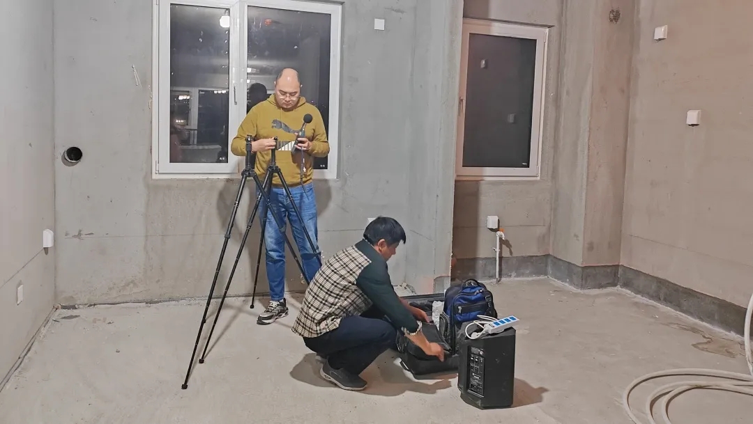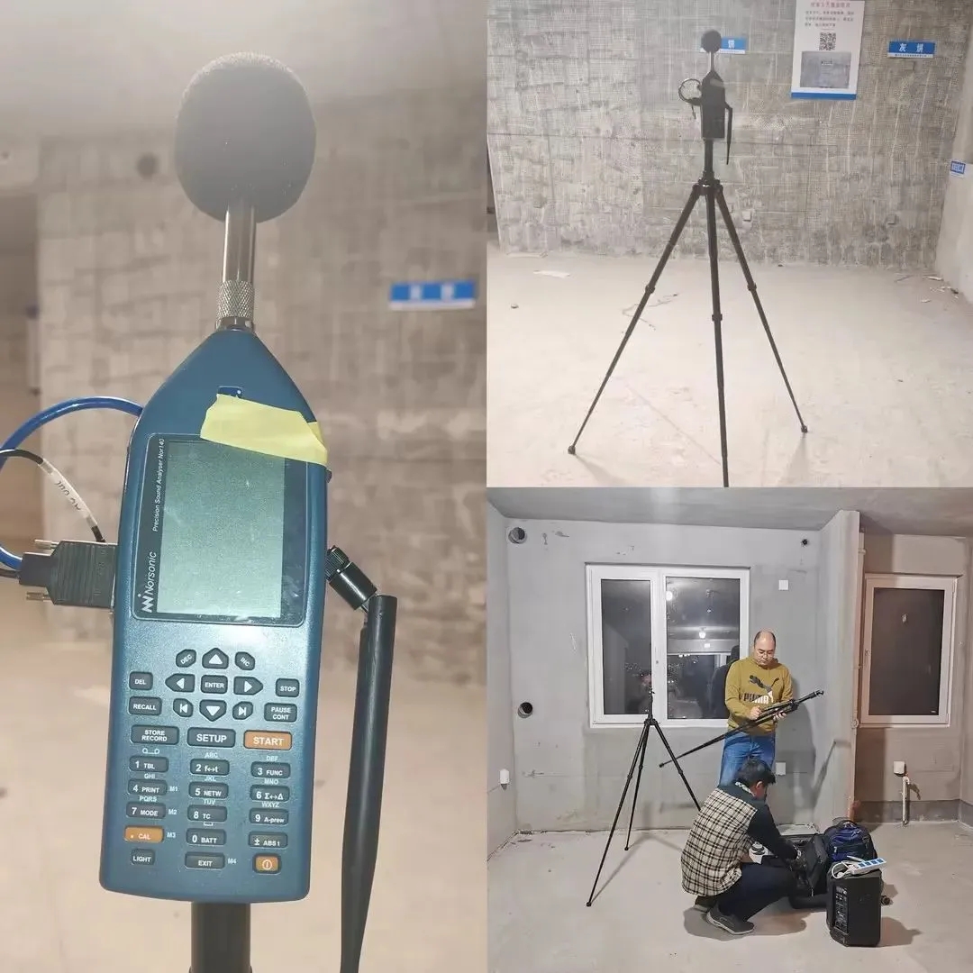 2024年4月,該中心在項(xiàng)目現(xiàn)場對尚微浮筑隔聲樓板進(jìn)行了全面、細(xì)致、嚴(yán)謹(jǐn)?shù)臋z測評估。檢測內(nèi)容涵蓋現(xiàn)場聲級計(jì)測量、頻譜分析以及撞擊聲源模擬測試,全方位評估出樓板的隔聲性能。