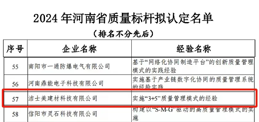 潔士美建材科技有限公司榮獲河南省質量標桿企業