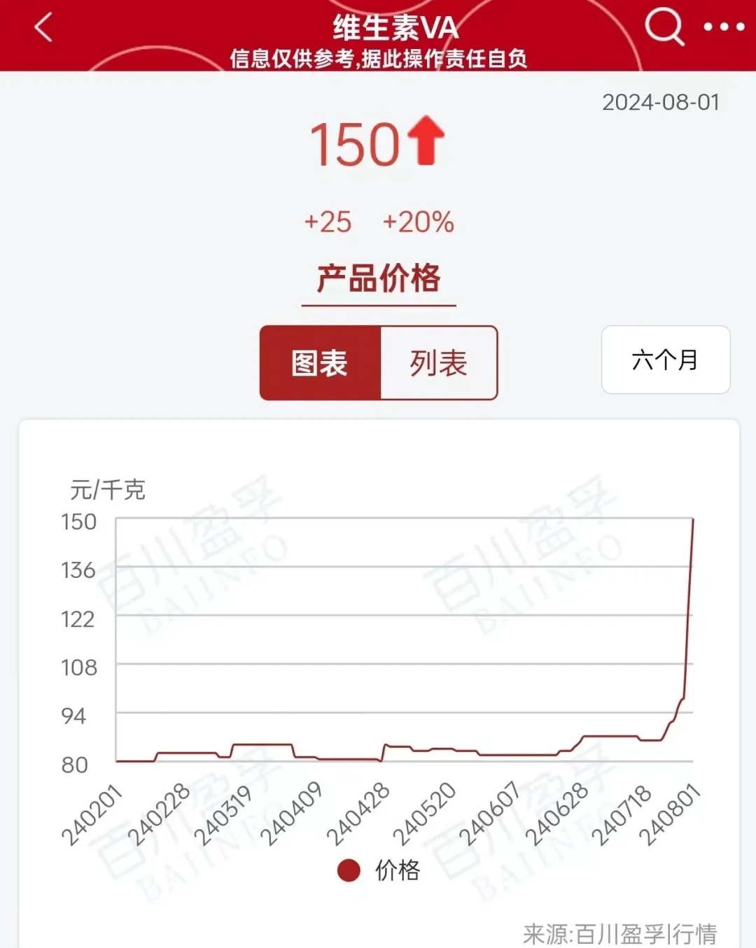 數據顯示,VA價格方面,7月30日為98元/千克,7月31日為125元/千克,8月1日為150元/千克;VE價格方面,7月30日為95.5元/千克,7月31日為108元/千克,8月1日為115元/千克。換而言之,巴斯夫德國工廠的事故發生后,VA價格兩天漲幅達到了53%;VE漲幅達到20%。