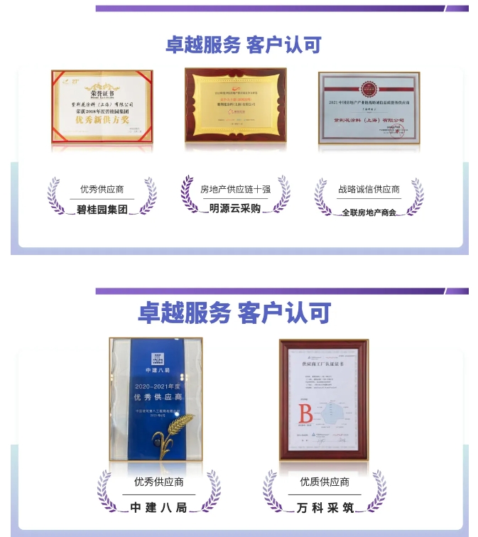 作為深耕涂料領域40余年的民族品牌,紫荊花擁有涵蓋內(nèi)外墻涂料、地坪涂料、木器涂料、藝術涂料、無機涂料、防火涂料、防腐涂料、大壩、風電等特種涂料、防水材料、輔材等全體系產(chǎn)品,擁有德國藍天使、美國FDA、美國CPC、美國USDA生物基認證、美國綠色衛(wèi)士金級認證、法國A+、日本JIS、中國綠色建材產(chǎn)品認證、中國環(huán)境標志產(chǎn)品認證等多項國內(nèi)外權威認證,擁有國家級綠色工廠、CNAS國家認可實驗室等一系列品牌硬核實力,可為客戶提供全面、系統(tǒng)、專業(yè)的全場景涂裝解決方案,紫荊花優(yōu)質(zhì)完備的產(chǎn)品體系、高效的供應保障、專業(yè)的服務能力受到了戰(zhàn)略合作客戶的廣泛認可和好評。