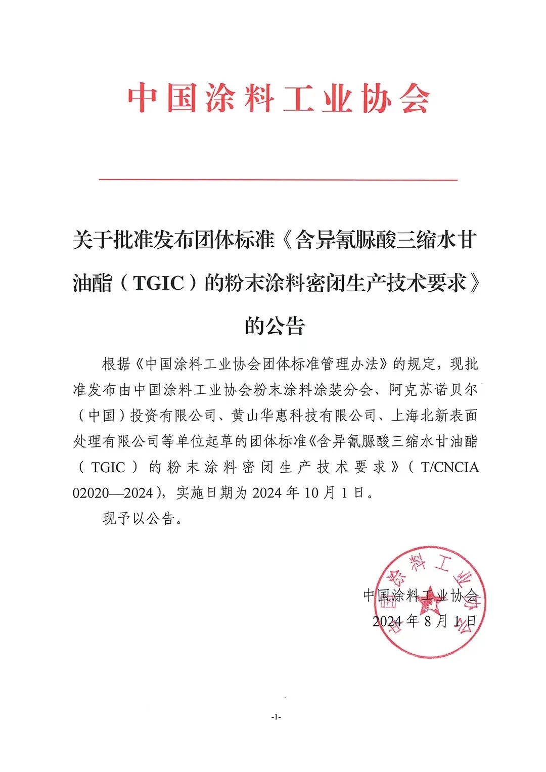 2)2024年1月3日,中國涂料工業協會發布了《關于發布2023年(第二批)中國涂料工業協會團體標準立項計劃項目的通知》,《含異氰脲酸三縮水甘油酯(TGIC)的粉末涂料密閉生產工藝要求》項目編號為9號;