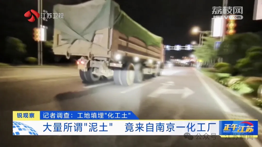記者近日夜間來(lái)到北沿江高鐵南京浦口永寧段的施工現(xiàn)場(chǎng)看到,多輛載重卡車(chē)駛?cè)脒@處工地,將裝載的物質(zhì)倒入坑中進(jìn)行填埋。車(chē)上卸下來(lái)的是顏色發(fā)紅類(lèi)似于泥土的物質(zhì),有淡淡的刺鼻味道。