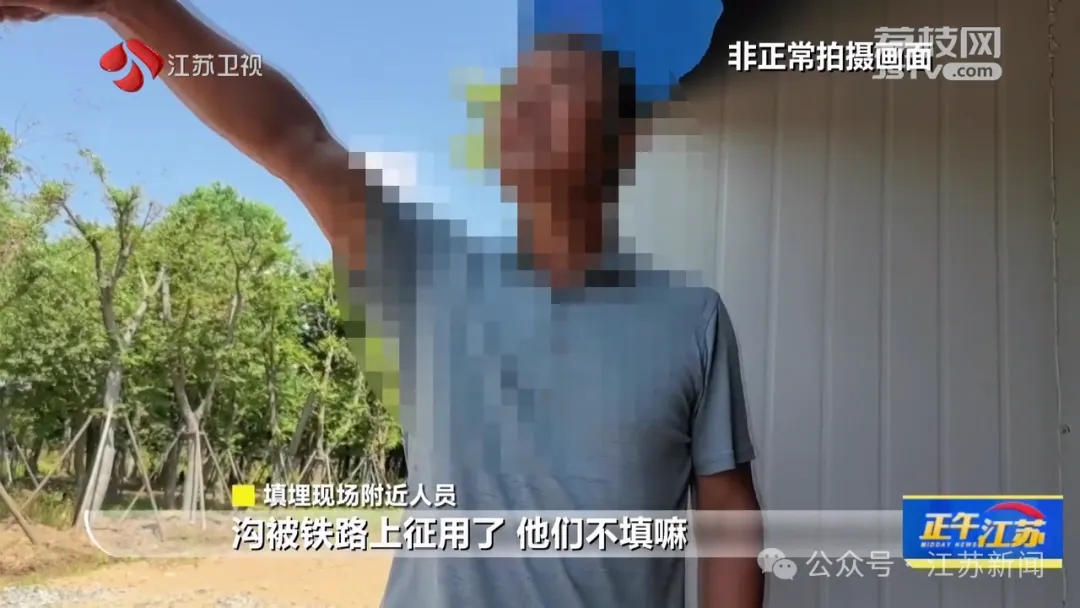 次日記者再次來(lái)到填埋現(xiàn)場(chǎng)時(shí)發(fā)現(xiàn),白天這里確實(shí)不施工。附近人員證實(shí),這種晝伏夜出的填埋工作已經(jīng)持續(xù)了一段時(shí)間。現(xiàn)場(chǎng)附近人員表示,“這個(gè)已經(jīng)很久了,10天之前就填了。溝被鐵路上征用了,他們不填嘛,這里說(shuō)是要搞什么基站,要堆兩三米高,新鮮的是昨天晚上倒的,在上面倒了有半個(gè)月了。”