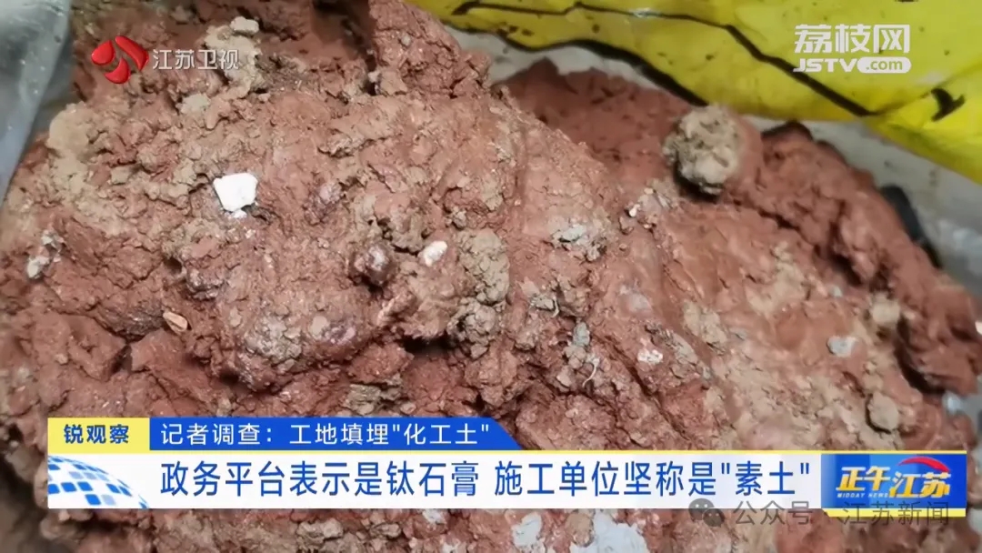 現(xiàn)場(chǎng)施工人員對(duì)于物品的來(lái)諱莫如深,知情人則表示,之所以司機(jī)和現(xiàn)場(chǎng)工作人員不愿意多說(shuō),是因?yàn)楝F(xiàn)場(chǎng)填埋進(jìn)去的是從化工廠出來(lái)的鈦石膏。并表示,“這個(gè)東西應(yīng)該是鈦白公司的固廢土,被拖到工地去了。實(shí)際上工地要的是正常土,這個(gè)土跟正常土是不一樣的,顏色泛紅,白天我們從那里走都有點(diǎn)異味。”