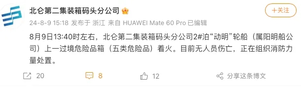 聲明稱,該公司今日獲悉所屬“動明”輪(YM Mobility)于寧波舟山港作業(yè)時,船上發(fā)生失火事故,事故發(fā)生原因尚待厘清。