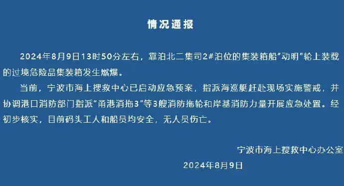 北侖第二集裝箱碼頭分公司發(fā)布公告稱:8月9日13:40時左右,北侖第二集裝箱碼頭分公司2#泊“動明”輪船(屬陽明船公司)上一過境危險品箱(五類危險品)著火。目前無人員傷亡,正在組織消防力量處置。