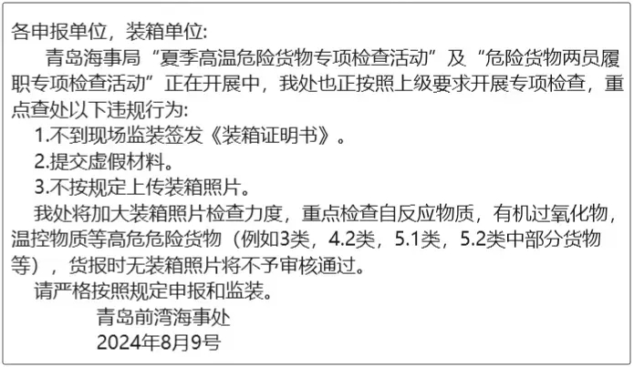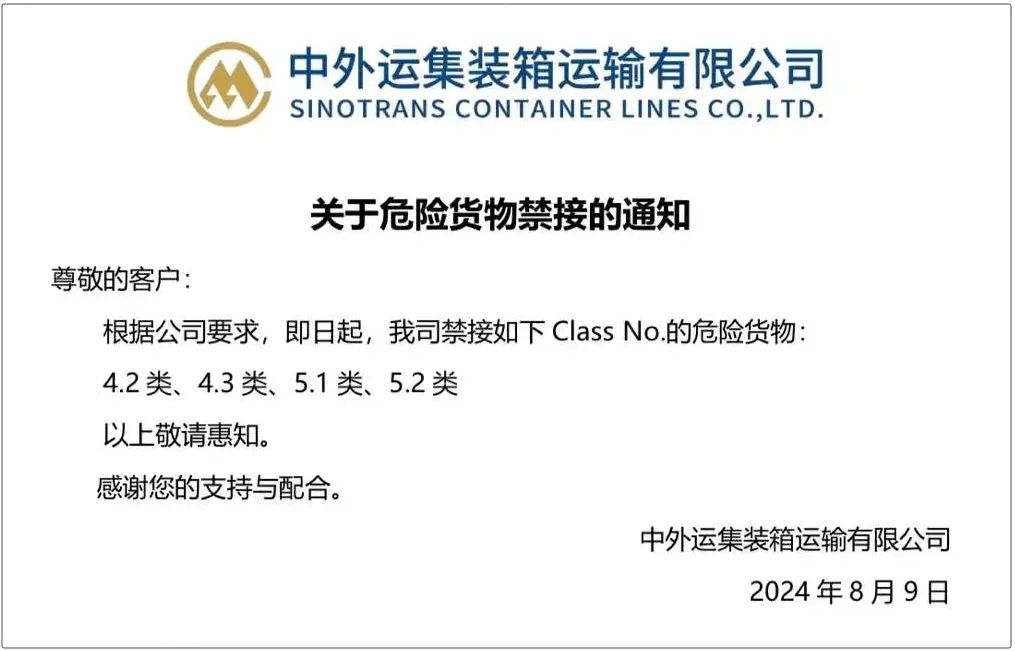另外,中外運集裝箱運輸有限公司今天發(fā)布了《關(guān)于危險貨物禁接的通知》: