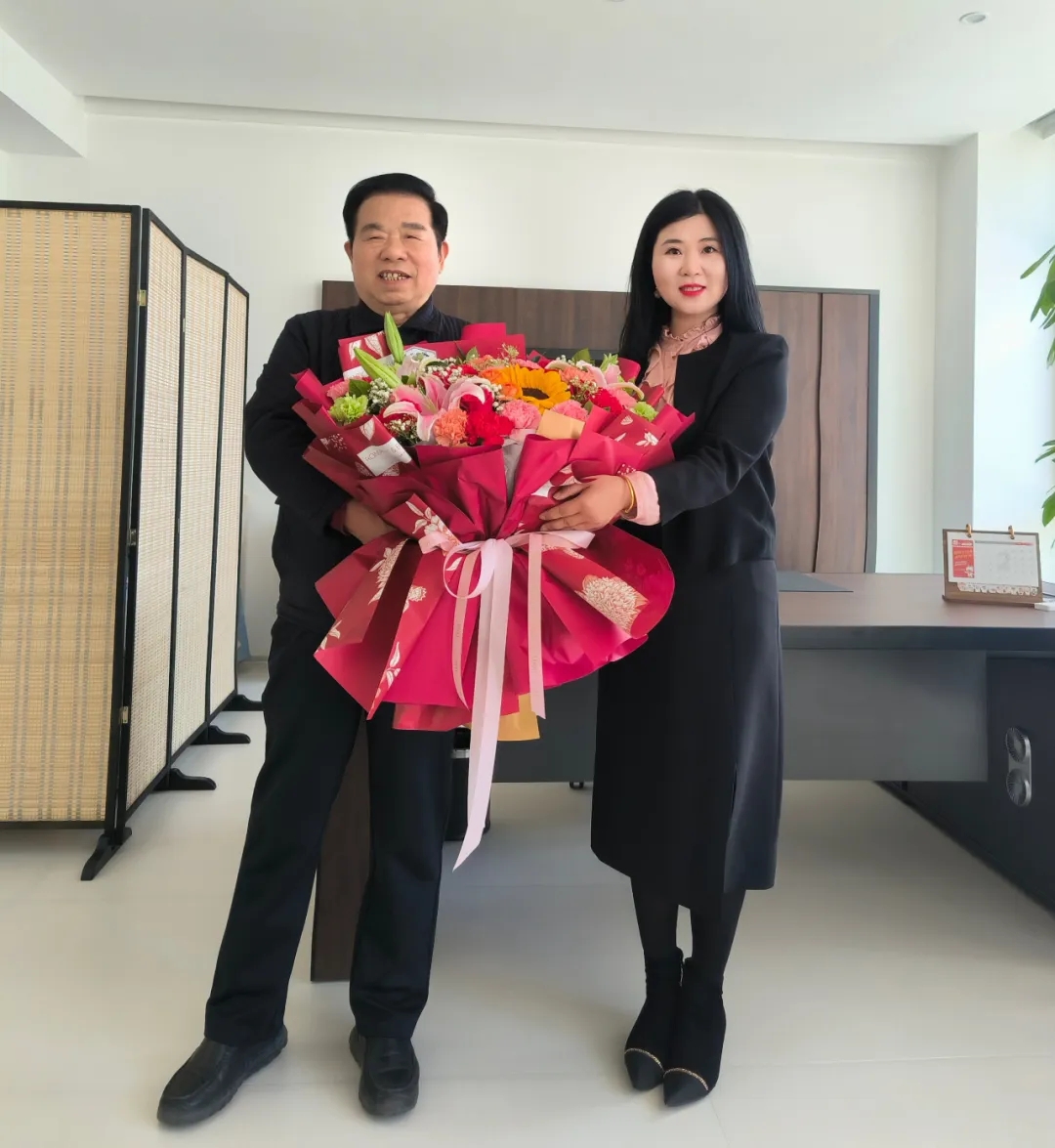 涂料采購(gòu)網(wǎng)王賽(右)到訪臥龍涂料并與創(chuàng)始人李國(guó)報(bào)(左)合影
