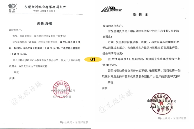 山東、山西、河南、四川等多個省市傳來原紙漲價函,將從8月1日上調瓦楞紙、白板紙30-50元/噸。