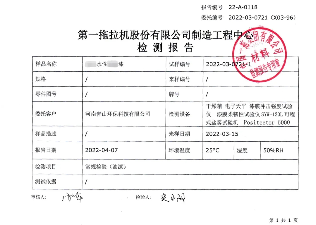 面對市場的質疑與挑戰,啟杉水性工業漆以實際行動回應了外界所有疑慮。曾有一位客戶,對啟杉系列產品的性能持保留態度,抽取了多款啟杉水性工業漆進行了一個多月的嚴格反復測試。結果顯示,啟杉水性工業漆在防腐性、耐候性、附著力等關鍵指標上均展現出卓越表現,不僅完全契合中國一拖集團東方紅系列大型農機水漆涂裝的高標準需求,更在多方面超越了客戶的預期,充分驗證了其技術實力與品質保障。