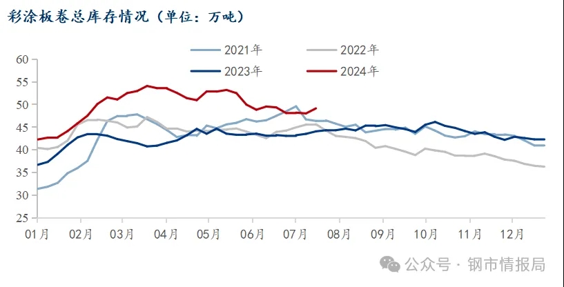 前面我們提到,2024年上半年內需不暢,其中最直觀的一個表現便在于整體庫存的不斷攀升。截止到2024年7月19日,彩涂板卷總庫存49.15萬噸,年同比增加5.07萬噸,增幅11.5%。2024年整體彩涂板卷庫存走勢基本可以概括為“累庫周期長、庫存去化速度慢”。年后回來,彩涂板卷總庫存便攀升4年來最高位54.09萬噸,年內最低庫存為48.03萬噸,為7月12日的數據。并且彩涂板卷并未能持續去庫,反而呈現階段性庫存增加的情況,值得關注。
