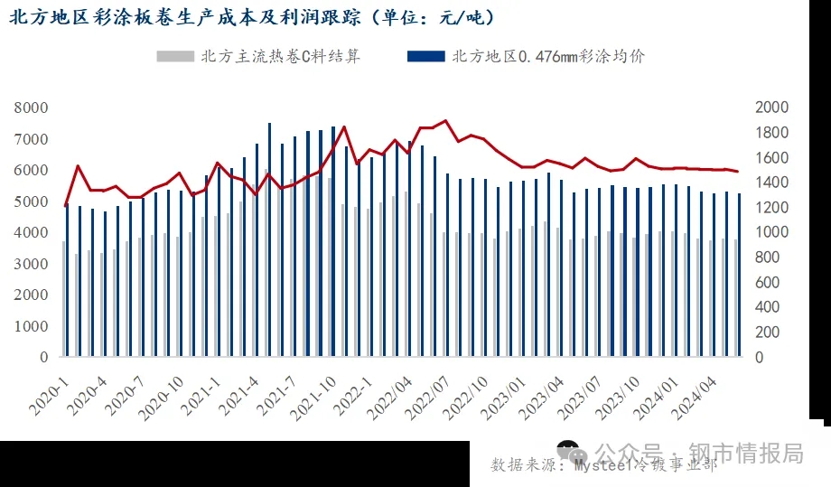 在冷軋、鍍鋅、彩涂三大品種中,彩涂屬于末端品種,也是最具附加值的一個品種,但是今年彩涂板卷的盈利情況不盡如人意。從我們對比的1-6月份北方地區民營彩涂板卷價格與主流熱卷結算價格來看,2024年市場價格與主流結算的價差基本在1487-1514元/噸,數據相比2023年來說相差不大。正常從熱卷到彩涂,民營鋼廠的加工成本在1000-1300元/噸。或許有人認為那今年彩涂板卷盈利尚可,其實不然。如果從單噸彩涂的價格看,鋼廠仍舊有盈利空間。但如果從鋼廠整體生產量來看,就能發現上半年彩涂板卷鋼廠整體盈利水平較往年有明顯下降。部分后期加入到彩涂板卷生產當中來的企業,接單尤其不佳。