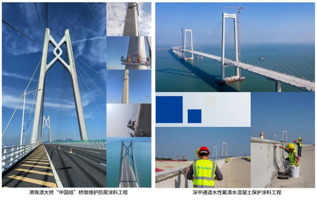 航天瀾諾水性氟清水混凝土保護涂料能夠為混凝土結構提供卓越的防護,延長使用壽命,已經在多個國家重點工程中應用,承接了深中通道、黃茅海跨海通道防撞欄及高架橋墩水性氟清水混凝土保護涂料工程、港珠澳大橋水性氟清水混凝土索塔維護涂裝工程供料、南沙大橋基材防腐涂料涂裝工程供料,虎門大橋、藤州潯江大橋索塔及錨碇砼基材防腐涂料維修涂裝工程等。