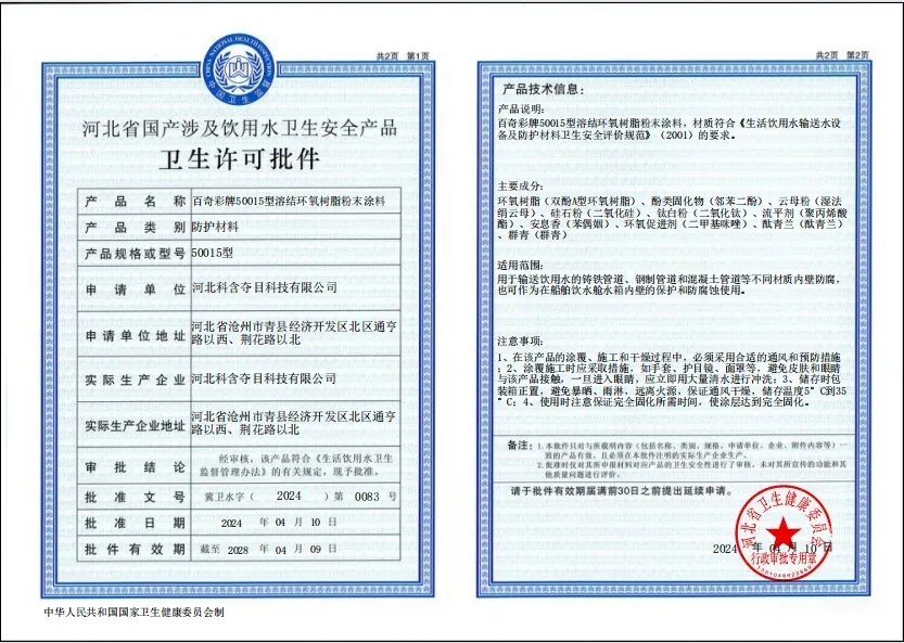 河北科含奪目科技有限公司(以下簡稱“科含奪目”),作為專注粉末涂料領域的企業,一直致力于為輸水管道提供高效、環保的防腐解決方案。企業憑借深厚的行業積淀和強大的科研實力,成功研發出百奇彩50015型溶劑環氧樹脂粉末等一系列具有自主知識產權的防腐產品。這些產品以其卓越的性能和廣泛的應用領域,贏得了市場的廣泛認可和好評。