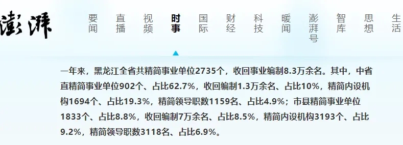 事實上,近幾年國家多次提出縮減公務人員編制的相關要求,政府機構這兩年也在逐漸完成改革重組工作。此前,中國戶籍人口第一大省——河南也傳出消息,省直事業機構按不低于50%精簡,編制精簡不低于30%,科級和事業編制16名以下的事業單位直接撤銷。最終結果是,連廳級領導職數都精簡了9.3%,處級領導職數直接砍掉了25.5%。