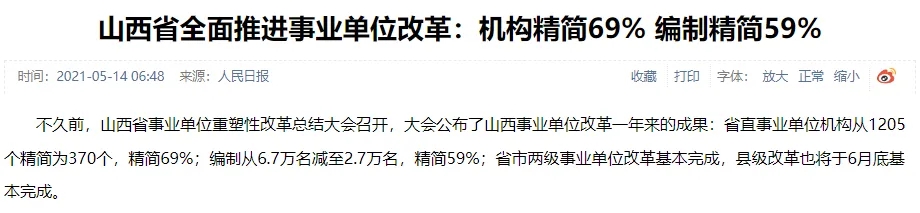 除了河南之外,另外幾個全國深化事業單位改革全域試點也陸續曝出動作。黑龍江早已完成改革,精簡事業單位2735個,收回事業編制8.3萬余名。內蒙古完成自治區247個經營類事業單位改革,區本級精簡收回3000余名事業編制。山西事業單位編制從6.7萬名減至2.7萬名,精簡4萬,有900多家經營性事業單位轉企改制。