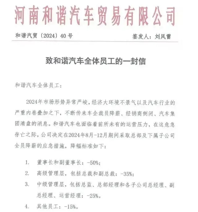 國內豪華汽車品牌經銷商和諧汽車被曝全員降薪,據網傳《一封信》顯示,和諧汽車決定在2024年8月-12月期間采取總部及下屬子公司全員降薪的應急措施。其中,董事長和副董事長降薪50%。和諧汽車回應稱,“全員降薪是我們主動適應市場大環境的階段性舉措。”