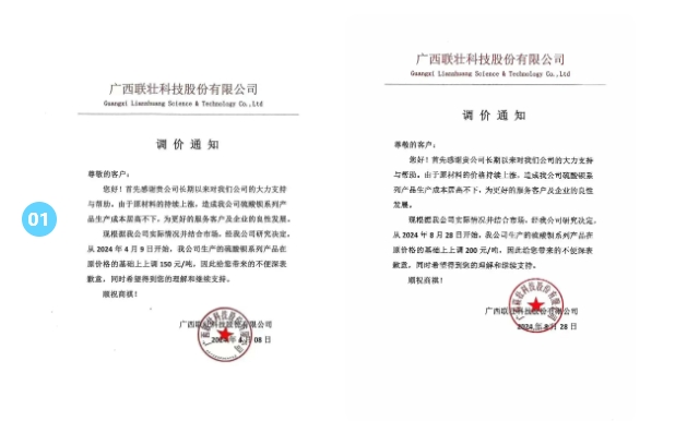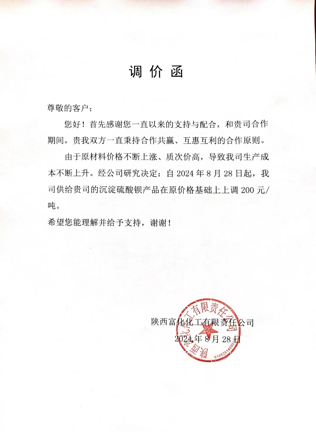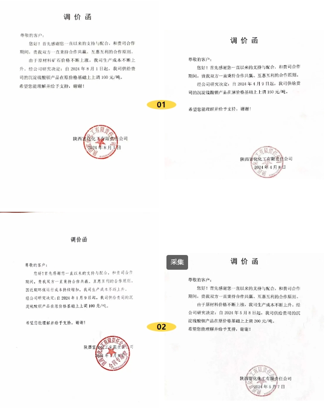 涂料采購網注意到,這已經是該企業在2024年發布的第5張漲價函。今年1月8日、4月8日,5月7日,8月1日,陜西富化化工宣布沉淀硫酸鋇產品價格分別上漲100元/噸、150元/噸、200元/噸、100元/噸,全年累計上漲750元/噸。