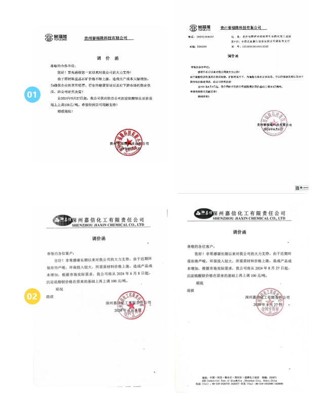 嘉信化工、貴州譽福隆科技等于6月和8月發布調價函,宣布沉淀硫酸鋇價格上調100元/噸。