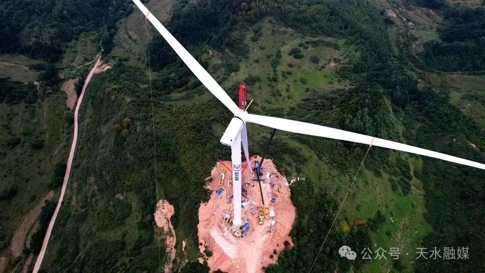 在清水縣盤龍山100MW風電項目施工現場,隨著03號風機的葉輪在百米高空與機艙成功對接,標志著該項目首臺風機吊裝作業完成,為年底前實現全容量并網發電目標打下了基礎。