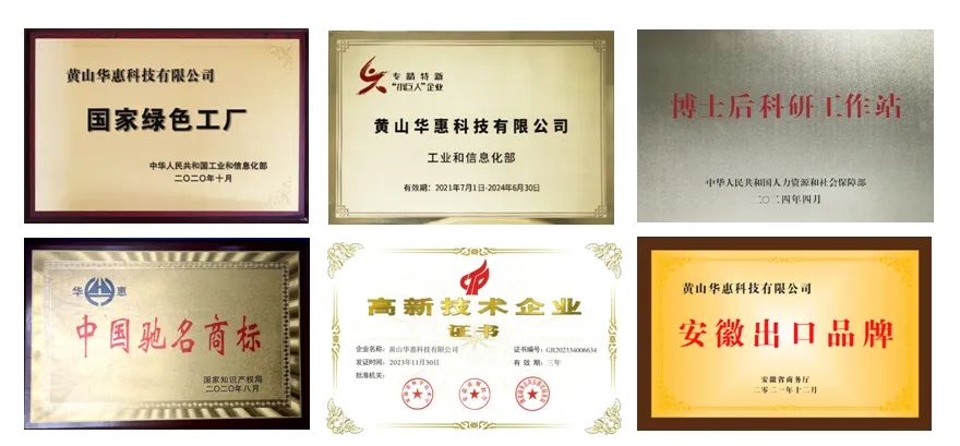 一路走來,黃山華惠能贏得眾多涂企的高度贊譽,這與其堅持攻堅核心技術領域的智慧與努力息息相關。正是由于始終堅持自主研發,黃山華惠才能連續5次通過國家高新技術企業認定,榮獲國家知識產權優勢企業、國家專精特新“小巨人”企業和安徽省技術示范企業、國家綠色工廠等榮譽稱號,至今已成為擁有56項專利(23項發明專利)、安徽省新產品10項的創新導向型企業。