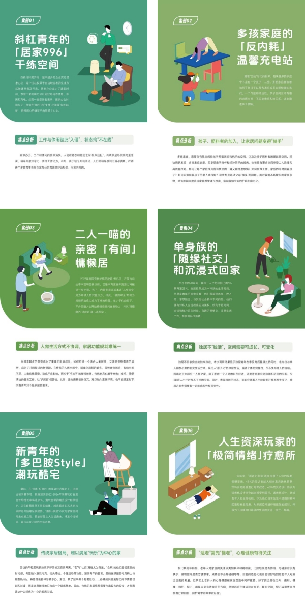 針對不同消費群體的獨特生活方式與個性化需求,報告深入剖析并精心打造了一系列專屬的家居設計解決方案。斜杠青年的高效居家生活、多孩家庭的溫馨互動空間、寵物友好家庭的和諧共處、單身族的沉浸式回家體驗、新青年的潮玩酷宅與老年群體的適老化設計,三棵樹以敏銳的市場洞察力和卓越的設計能力,為這六大細分人群量身定制理想中的家居空間。