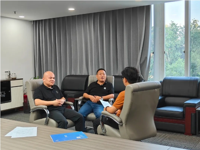 涂料采購網(wǎng)大V(右)專訪立幸邦董事副總經(jīng)理羅峰(左)及銷售副總經(jīng)理李強(中)