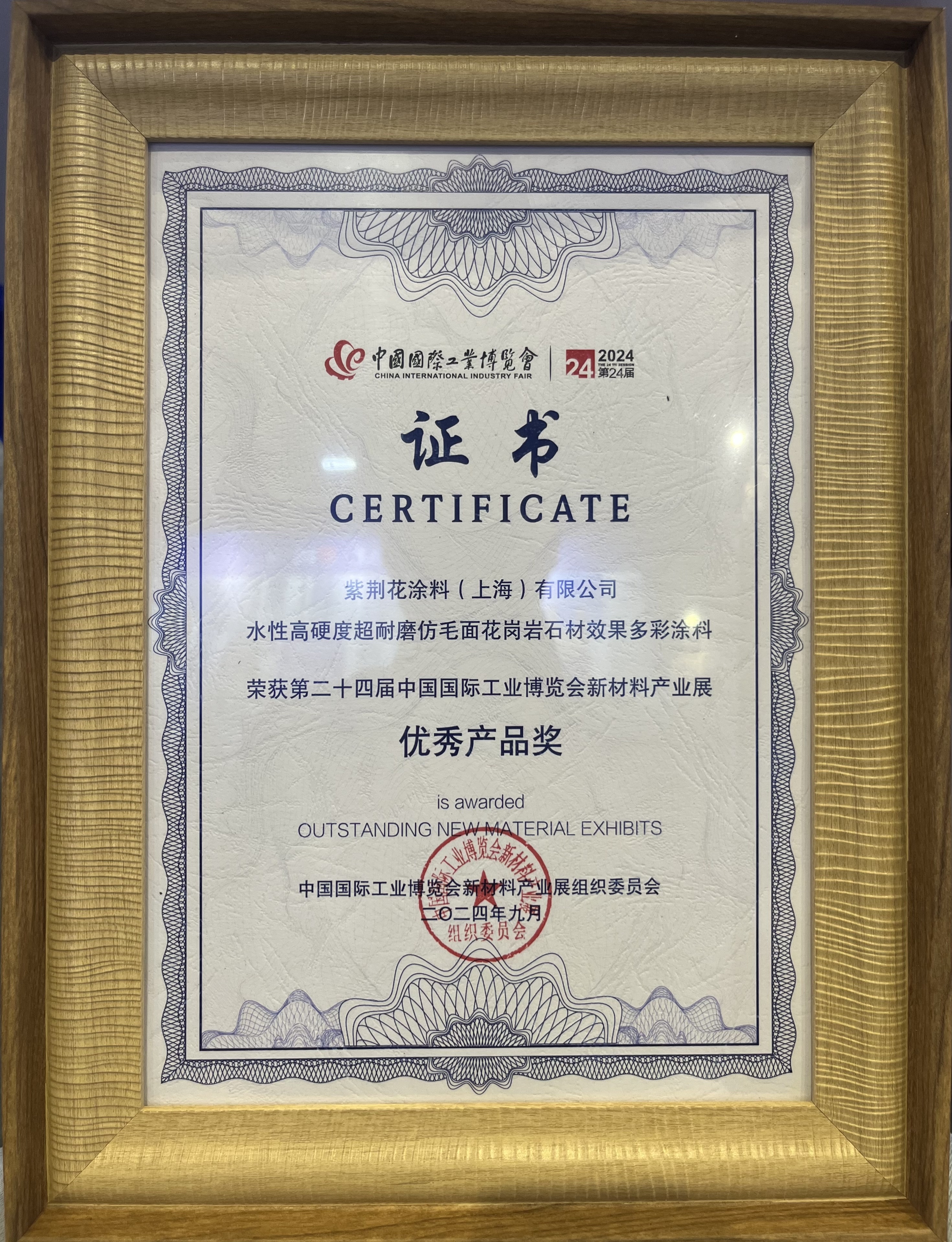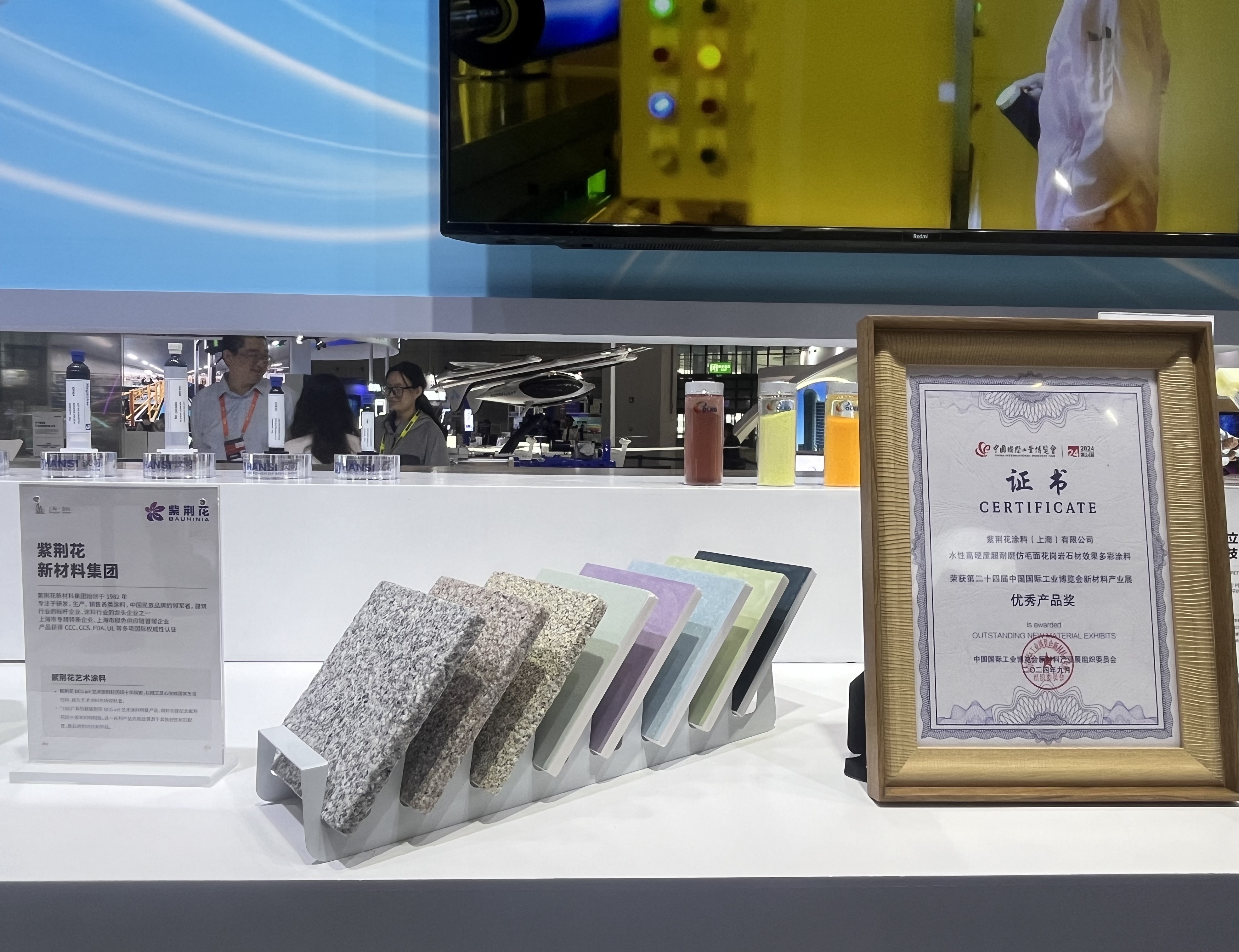 在展會同期舉辦的2024中國國際工業(yè)博覽會新材料產業(yè)發(fā)展高峰論壇上,紫荊花更憑借“水性高硬度超耐磨仿毛面花崗巖石材效果多彩涂料”這一國家發(fā)明專利技術產品,榮獲第二十四屆中國國際工業(yè)博覽會新材料產業(yè)展優(yōu)秀產品獎!