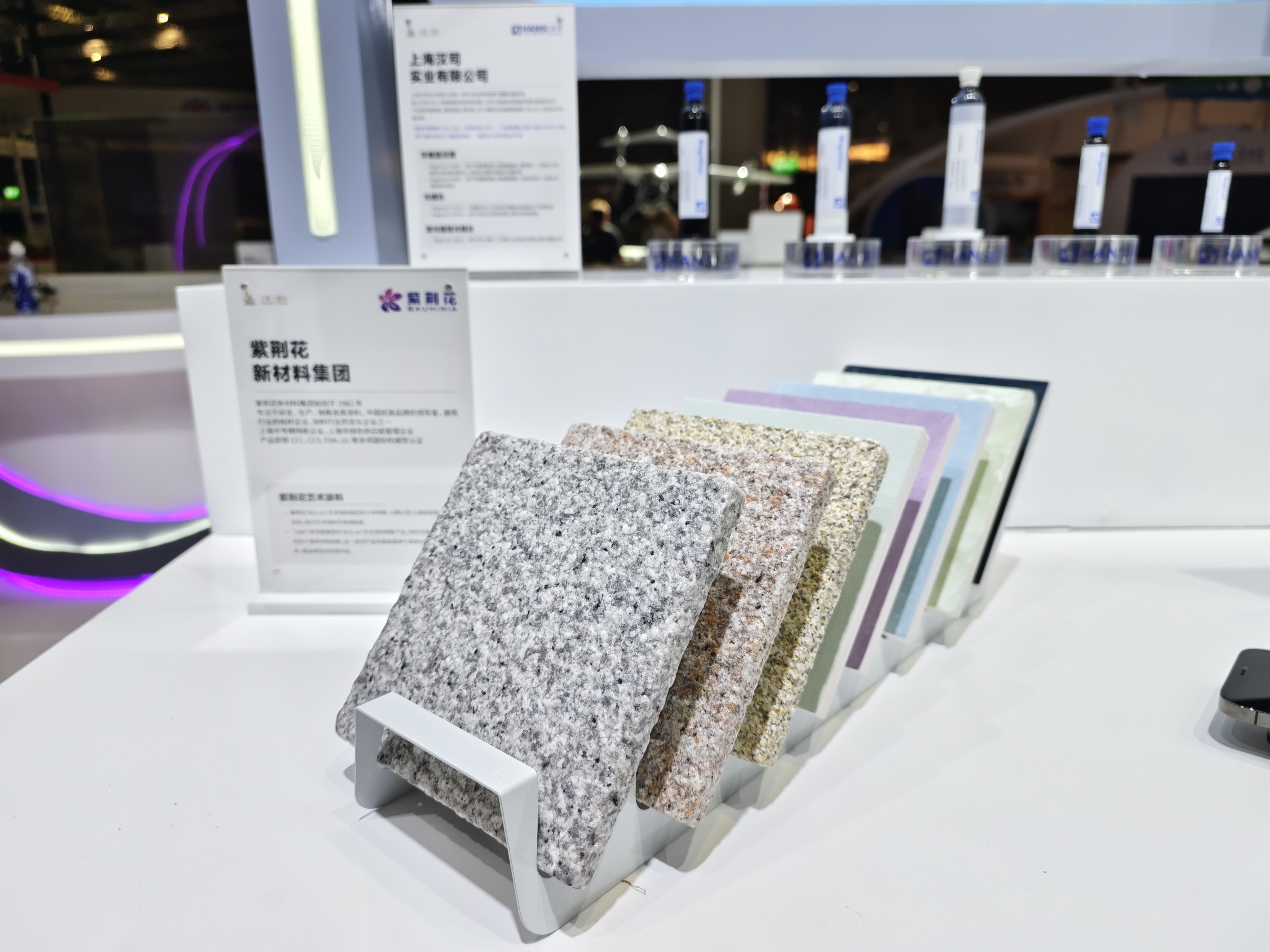 作為金山區(qū)優(yōu)秀企業(yè)代表,紫荊花與其他金山區(qū)知名企業(yè),共同亮相位于國家會展中心7.2H館的“上海灣區(qū) 智造金山”主題展位,重點展示了紫荊花仿石多彩涂料和紫荊花BCG藝術涂料兩大優(yōu)勢產品系列。