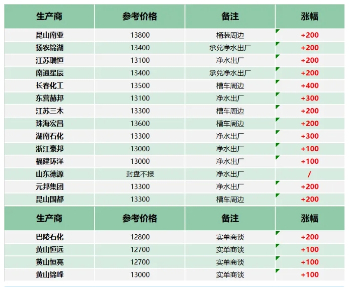 環氧氯丙烷的漲價也已經迅速蔓延至下游的環氧樹脂行業,導致環氧樹脂價格拉漲。華東液體環氧樹脂報價13600-13800元/噸,日漲75元/噸。華南液體環氧樹脂報價13800-14100元/噸大桶承兌送到,日漲75元/噸。華東固體環氧樹脂報價12700-13000元/噸,日漲50元/噸。不少樹脂企業報價上漲200-300元/噸。