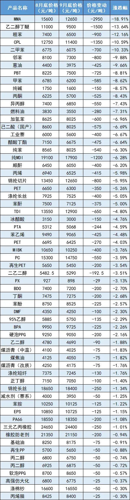 事實(shí)上,正如眾多化工人所預(yù)期的,今年的“金九”旺季失約了。下游訂單冷淡的基礎(chǔ)上,化工品的售價也進(jìn)入了下滑通道。據(jù)涂料采購網(wǎng)不完全統(tǒng)計(jì),截至9月末,已有60余種化工品價格較8月末環(huán)比下滑。這其中包括溶劑類的乙二醇丁醚、二甲苯、甲苯、丙酮、異丙醇、醋酸丁酯,基礎(chǔ)原材料類的MMA、粗苯、純堿、MDI、純苯、TDI、PTA、苯乙烯、BDO,以及下游類的PA66、PP、EPS、PET、PC、PBT等,價格下滑高達(dá)近3000元/噸,跌幅也接近了20%左右。