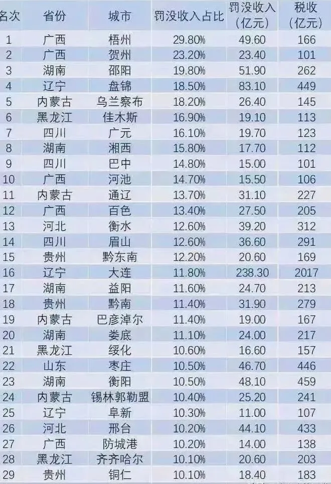 另據網絡曝光的全國罰沒收入城市排行榜數據,罰沒收入占比排名最高的前10個城市分別是梧州29.8%、賀州23.2%、邵陽19.8%、盤錦18.5%、烏蘭察布18.2%、佳木斯16.9%、廣元16.1%、湘西15.8%、巴中14.8%、河池14.7%。前三十高城市罰沒收入額度最高的就是遼寧大連,達到了238.3億元。