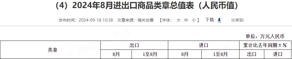 近日,海關(guān)總署公布2024年前三季度進(jìn)出口數(shù)據(jù),以美元計(jì),中國(guó)9月進(jìn)口同比0.3%,預(yù)期0.9%,前值0.50%;出口同比2.4%,預(yù)期6%,前值8.70%。中國(guó)9月貿(mào)易帳817.1億美元,預(yù)期898億美元,前值910.2億美元。雖然看起來(lái)仍是正值增長(zhǎng),但比前值有所下滑,且不及預(yù)期。值得注意的是,這是已知的本年度出口增速最低月份,同時(shí)9月出口同比回落至2024年2月以來(lái)的最低值。
