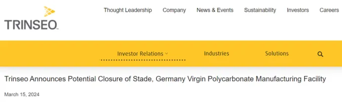 盛禧奧可能將德國施塔德(Stade)的聚碳酸酯(PC)生產基地關閉。并與子公司盛禧奧德國公司的勞資委員會展開了磋商程序,預計將于2024年底前完成。
