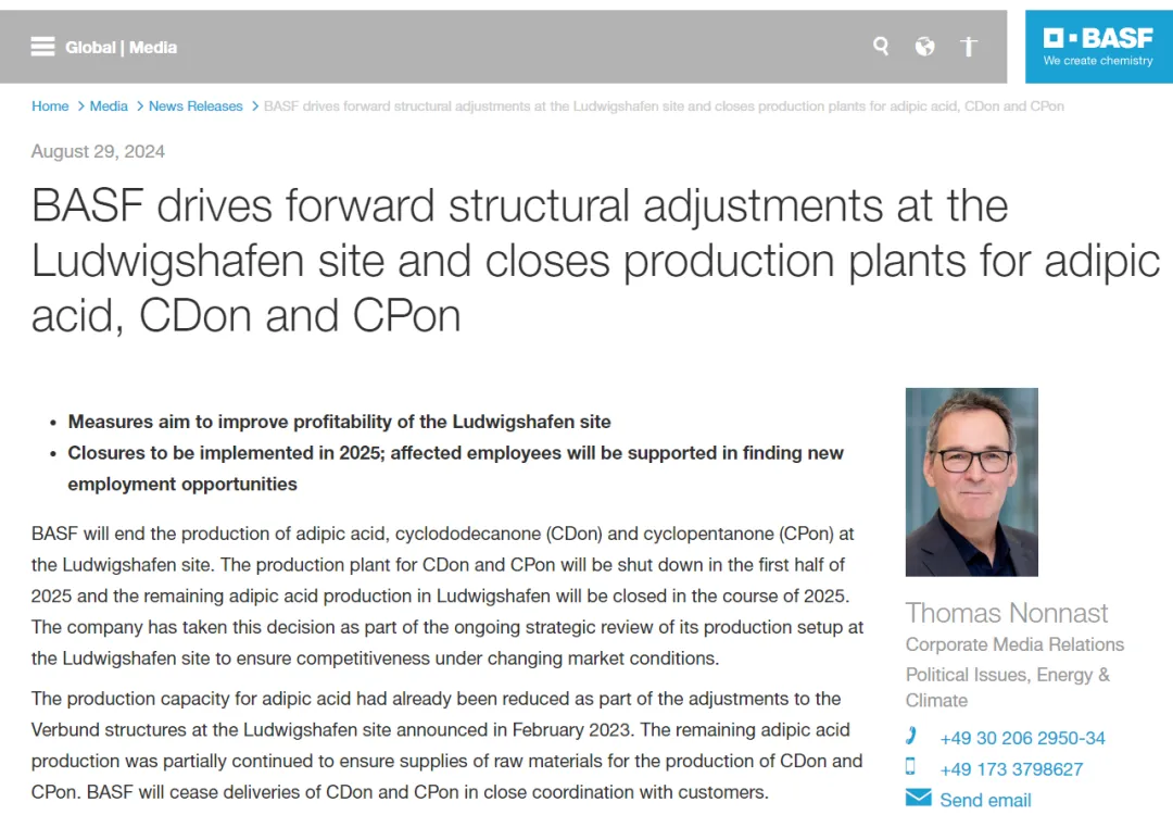 巴斯夫宣布將關閉德國路德維希港生產基地生產己二酸、環十二酮(CDon)和環戊酮(CPon)的三家工廠。CDon和CPon生產工廠將于2025年上半年關閉,路德維希港一體化基地剩余的己二酸生產將于2025年關閉。