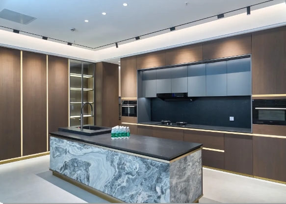 開(kāi)放式廚房區(qū)融合金屬、奢石與木皮元素