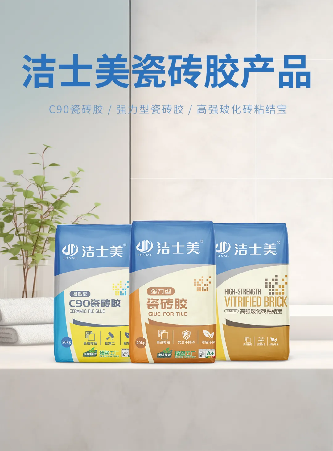 針對不同使用場景,潔士美推出三款瓷磚膠產品:C90易貼型瓷磚膠、強力型瓷磚膠及高強玻化磚粘結寶