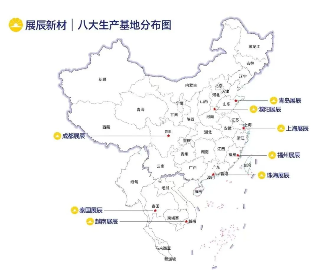 隨著行業發展,尤其是疫情后,供應鏈的布局尤為重要。目前,展辰新材在海內外已搭建8個生產基地,分別設于珠海、上海、青島、成都、福州、濮陽、越南平陽、泰國羅勇府,以此打造覆蓋國內北方、南方及海外市場的生產鏈網絡,優化產能結構,描繪了一幅從中國逐步邁向國際的藍圖。