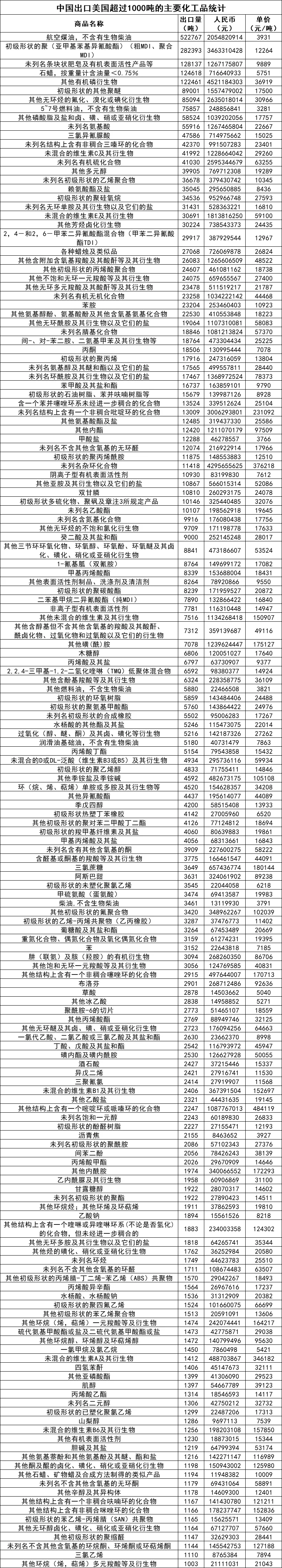 作為中國最大的出口國,美國市場被高關稅封鎖之后,對于中國的出口和經濟將帶來顯著沖擊。對于化工行業的影響也是不可忽視的。根據相關數據,中國出口美國的化工品種約400種。其中出口美國超過1000噸,不乏丙酮、樹脂、純MDI、丙烯酸、環氧樹脂、丙烯酸丁酯、季戊四醇、聚乙烯醇、苯等多種大化產品。