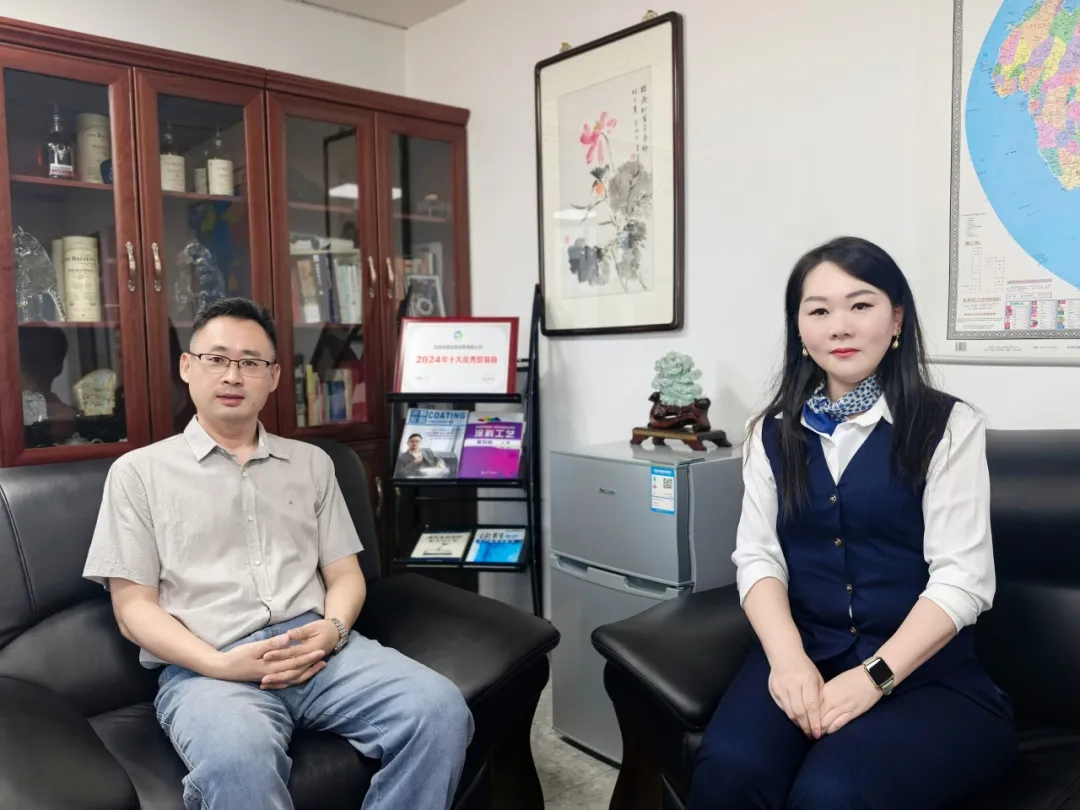 涂料采購網江雪(右)與尚德信嘉總經理張有祥(左)現場交流