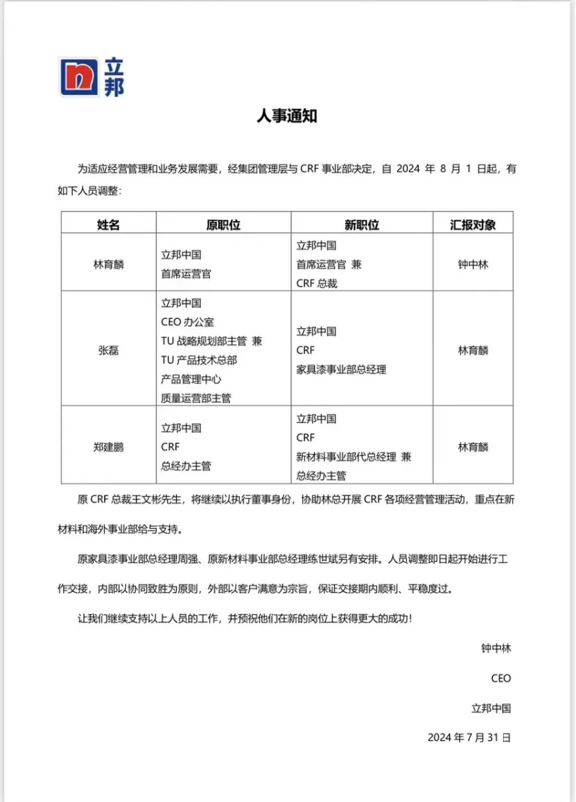 立邦中國宣布了一系列高層的人事變動(dòng),首席運(yùn)營官林育麟被任命為立邦中國首席運(yùn)營官兼CRF總裁;張磊晉升為立邦中國CRF家具漆事業(yè)部總經(jīng)理,CRF總經(jīng)辦主管鄭建鵬新職位是立邦中國CRF新材料事業(yè)部總經(jīng)理兼總經(jīng)辦主管。